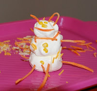 Mew ate a lot of the cheese(one of his favorites) and some of the carrot shreds. He was so serious about decorating though and trying so hard NOT to get his hands against the cream cheese at all! When he finished, he did take a tad of the cream cheese. He was less than thrilled with the taste.